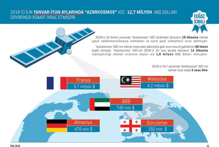 “İxrac İcmalı”nda həm də xidmət ixracına yer ayrılıb. Göstərilib ki, 2018-ci ilin yanvar-iyun aylarında “Azərkosmos” ASC tərəfindən dünyanın 19 ölkəsinə xidmət (peyk telekommunikasiya xidmətləri və optik peyk xidmətləri) ixrac edilib. Cari ilin ilk 6 ayında “Azərkosmos” ASC peyk və telekommunikasiya xidmətlərinin ixracından 12,7 milyon ABŞ dolları məbləğində gəlir əldə edib. “Azərkosmos” ASC-nin xidmət ixracından əldə etdiyi gəlir onun ümumi gəlirlərinin 88 faizini təşkil edib. 2018-ci ilin iyun ayında isə “Azərkosmos” ASC-nin xidmət ixracının dəyəri 1,6 milyon ABŞ dolları olub. “Azərkosmos” ASC-nin 2018-ci ilin ilk 6 ayı ərzində xidmət ixracının həyata keçirdiyi əsas ölkələr Fransa, Malayziya, BƏƏ, Almaniya, Gürcüstan və digərləridir.