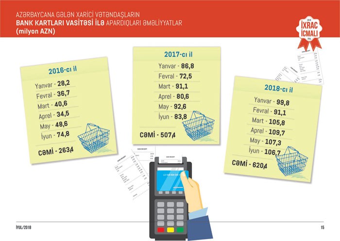 Eyni zamanda “İxrac İcmalı”nda məlumat verilib ki, 2018-ci ilin yanvar-iyun ayları ərzində Azərbaycana dünyanın 189 ölkəsindən 1325,0 min və ya ötən ilin müvafiq dövrü ilə müqayisədə 10,2 faiz çox əcnəbi və vətəndaşlığı olmayan şəxs gəlib. 2018-ci ilin yanvar-iyun ayları ərzində Azərbaycana gələn xarici vətəndaşların bank kartları vasitəsi ilə apardıqları əməliyyatların dəyəri 620,4 milyon manat təşkil edib. Yəni 2017-ci ilin müvafiq dövrü ilə müqayisədə 2018-ci ilin yanvar-iyun ayları ərzində Azərbaycana gələn xarici vətəndaşların bank kartları vasitəsi ilə apardıqları əməliyyatların dəyəri 113 milyon AZN və ya 22,3 faiz artıb.