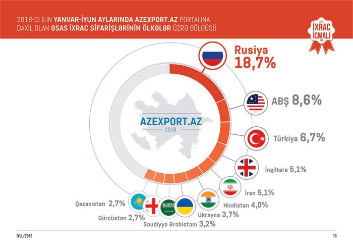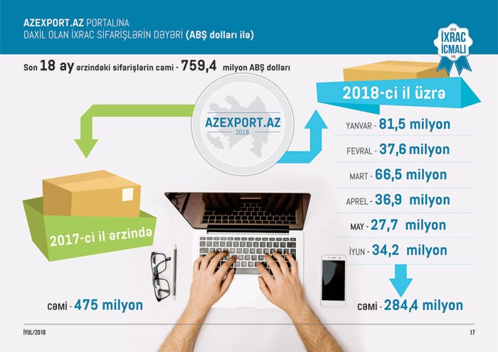 “İxrac İcmalı”nda 2018-ci ilin yanvar-iyun ayları ərzində Azexport.az portalına daxil olan ixrac sifarişləri barədə də məlumat verilib. Göstərilib ki, 2018-ci ilin iyun ayı ərzində Azexport.az portalına 34,2 milyon ABŞ dolları məbləğində ixrac sifarişləri daxil olub. Ümumilikdə isə 2018-ci ilin birinci yarısında Azexport.az portalına daxil olan ixrac sifarişlərinin dəyəri 284,4 milyon ABŞ dolları təşkil edib. 2017-ci ilin müvafiq dövrü ilə müqayisədə 2018-ci ilin yanvar-iyun aylarında Azexport.az portalına daxil olan ixrac sifarişləri dəyər baxımından 47,6 faiz artıb. Bu isə Azexport.az portalının ötən müddətdə dünya miqyasında daha çox tanınmasından qaynaqlanır. Qeyd edək ki, 2017-ci ilin yanvar ayından 2018-ci ilin 30 iyun tarixinə kimi (18 ay ərzində) Azexport.az portalına dünyanın 96 ölkəsindən daxil olan ixrac sifarişlərinin dəyəri 759,4 milyon ABŞ dolları təşkil edib.