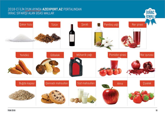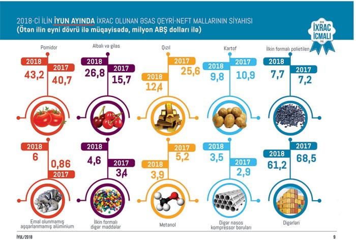 2018-ci ilin may ayında olduğu kimi iyun ayında da qeyri-neft sektoru üzrə ixracda tomat (pomidor) dəyəri ilə birinci olub (43,2 milyon ABŞ dolları). Cari ilin iyun ayında qeyri-neft sektoru üzrə ixracda albalı və gilas (26,8 milyon ABŞ dolları) ikinci, qızıl (sikkə kəsilməsində istifadə olunmayan, digər emal olunmamış formalarda - 12,4 milyon ABŞ dolları) isə üçüncü olub.