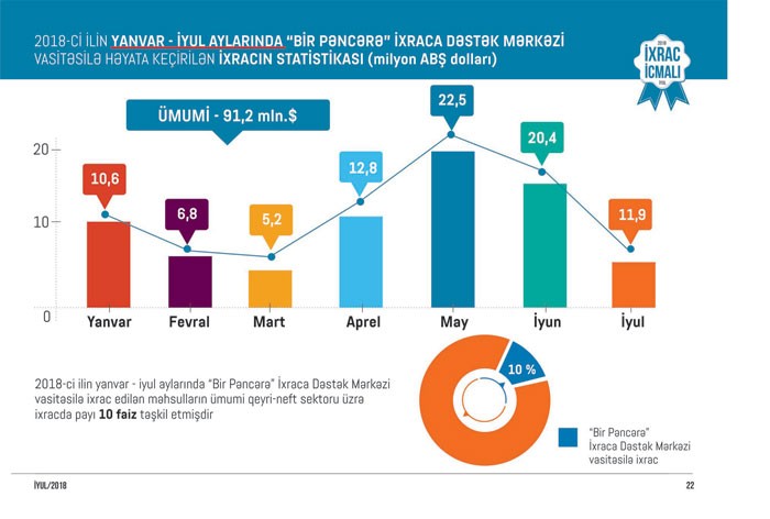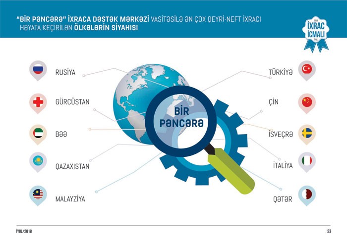 “İxrac İcmalı”nın iyul sayında “Bir Pəncərə” İxraca Dəstək Mərkəzinin fəaliyyəti barədə də məlumat verilib. Qeyd edilib ki, bu ilin iyul ayında “Bir Pəncərə” İxraca Dəstək Mərkəzi tərəfindən fiziki və hüquqi şəxslərə bir pəncərə prinsipi əsasında ixracla bağlı tələb olunan sertifikatlar verilib. Sertifikat verilən məhsullar Rusiya, Türkiyə, İran, İtaliya, İraq, Qazaxıstan, Gürcüstan, Ukrayna, İngiltərə, Sinqapur, BƏƏ, Çin, ABŞ daxil olmaqla dünyanın müxtəlif ölkələrinə ixrac olunub. Hazırda ölkənin qeyri-neft ixracının 10 faizindən çoxunun sənədləşdirilməsi “Bir Pəncərə” İxraca Dəstək Mərkəzində həyata keçirilir.
