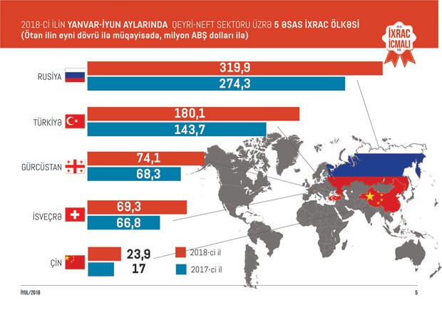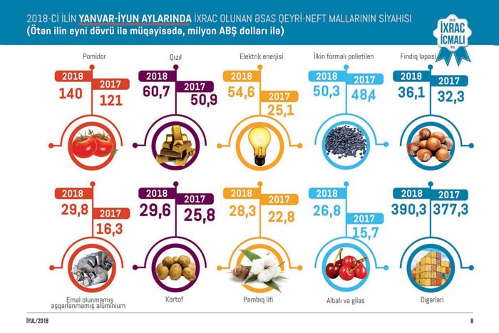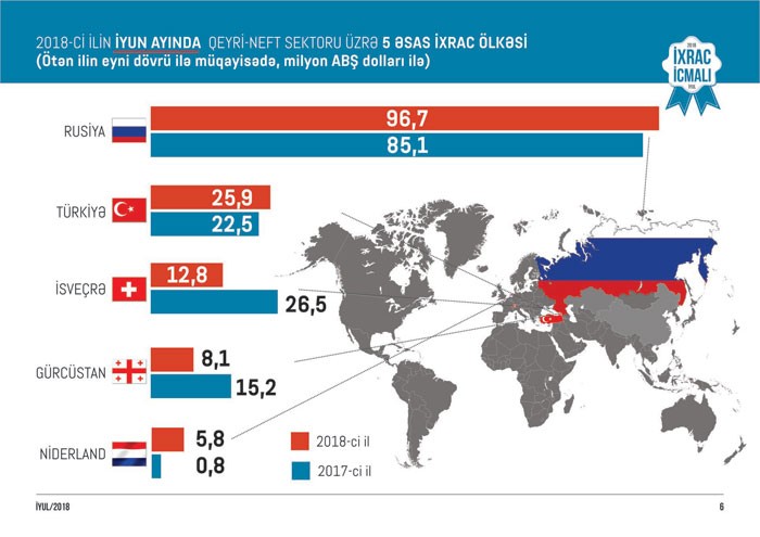 İcmalın bu sayında göstərilir ki, 2018-ci ilin yanvar-iyun ayları ərzində qeyri-neft sektoru üzrə ixrac 846,5 milyon ABŞ dolları təşkil edib. 2017-cı ilin müvafiq dövrü ilə müqayisədə cari ilin yanvar-iyun aylarında qeyri-neft sektoru üzrə ixrac 110,5 milyon ABŞ dolları və ya 15 faiz artıb. Dövlət Statistika Komitəsinin məlumatına əsasən cari ilin ilk 6 ayı ərzində Rusiyaya 319,9 milyon, Türkiyəyə 180,1 milyon, Gürcüstana 74,1 milyon, İsveçrəyə 69,3 milyon və Çinə 23,9 milyon ABŞ dolları dəyərində qeyri-neft sektoruna aid mal ixrac edilib.
