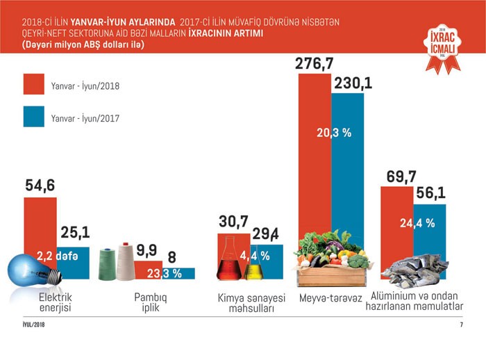 2017-ci ilin müvafiq dövrü ilə müqayisədə 2018-ci ilin ilk yarısında elektrik enerjisinin ixracı 2,2 dəfə, alüminium və ondan hazırlanan məmulatların ixracı 24,4 faiz, pambıq ipliyinin ixracı 23,3 faiz, meyvə-tərəvəzin ixracı 20,3 faiz, plastmassa və onlardan hazırlanan məmulatların ixracı 13,7 faiz, kimya sənayesi məhsullarının ixracı 4,4 faiz artıb.