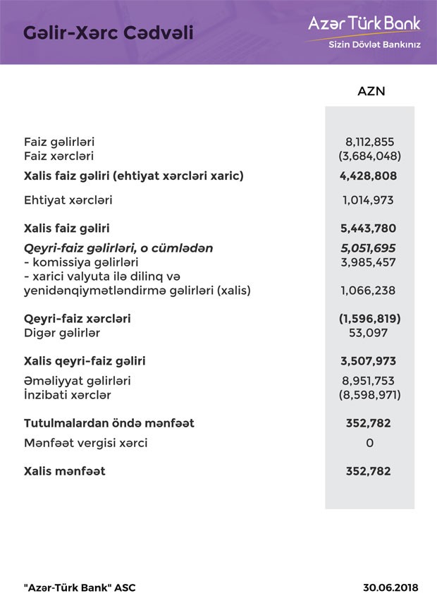 “Azər Türk Bank” ASC 2018-ci ilin birinci yarısını 352 min 782 manat xalis mənfəətlə başa vurub. Müqayisə üçün qeyd edək ki, Bank 2017-ci ilin birinci yarısında 1 milyon 431 min manat xalis mənfəət əldə etmişdi.