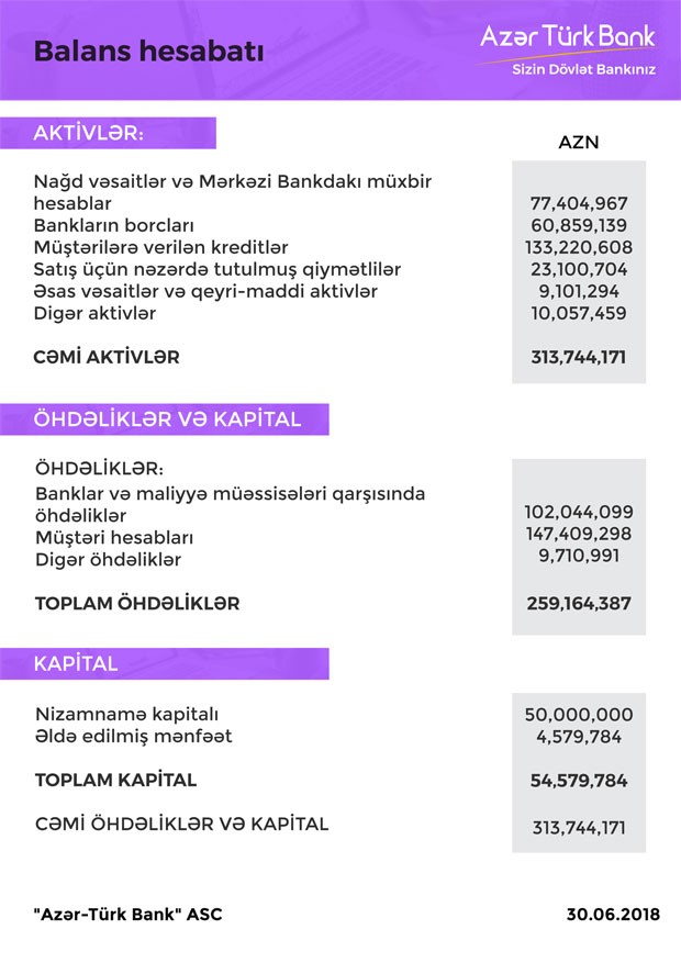 30 İyun 2018-ci tarixində “Azər Türk Bank” 313 milyon 744 min manat cəmi aktivlərə (o cümlədən 133 milyon 220 min manatı müştərilərə verilmiş kreditlər) malik olub. Ötən ilin eyni dövründə Bank 309 milyon 429 min manat cəmi aktivlərə (o cümlədən 126 milyon 274 min manatı müştərilərə verilmiş kreditlər) malik idi. Bankın aktivləri 1,4%, kredit portfeli isə 5,5% artıb.