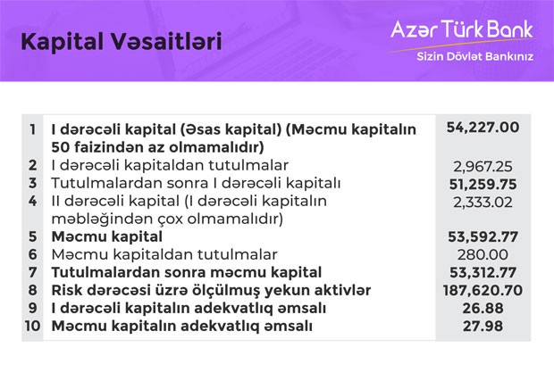 30 İyun 2018-ci il tarixində “Azər Türk Bank” 53 milyon 313 min manat məcmu kapitala malik olub.Bank öən ilin eyni dövründə 54 milyon 811 min manat məcmu kapitala malik idi.