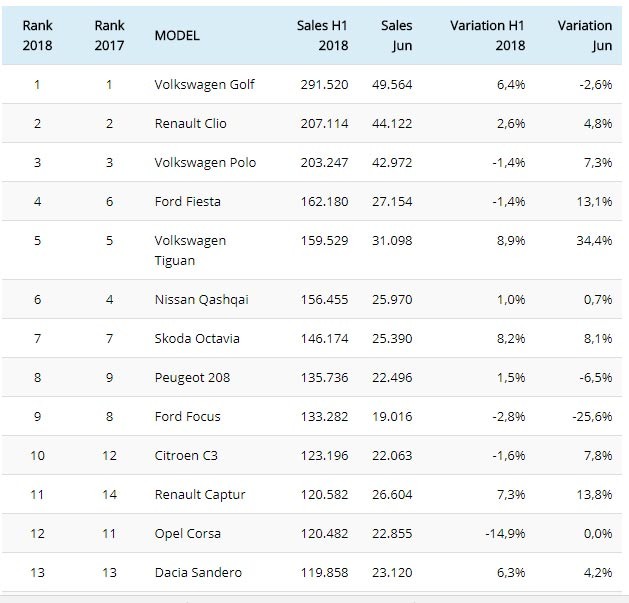 Sıralamanın ilk pilləsini artıq illərdir ki, Volkswagen Golf modeli qoruyub saxlayır. 6 ay ərzində 291 520 ədəd Volkswagen Golf satılıb.