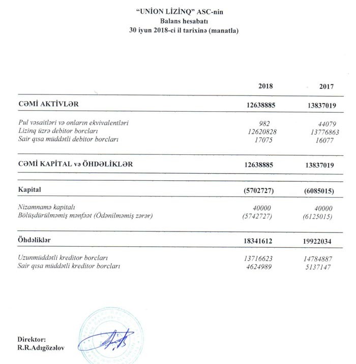 "Union Liziniq"in kapitalı mənfi zonadadır. Yığılmış zərərə görə kapital 5 milyon 703 min manat kəsirdədir.