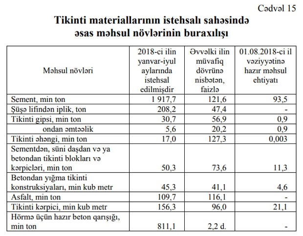 “Tikinti materiallarının istehsalı sahəsində fəaliyyət göstərən müəssisələr tərəfindən istehsal edilmiş məhsulun ümumi dəyəri 31,7 faiz artaraq 322,8 milyon manat təşkil etmişdir. Hörmə üçün hazır beton qarışığının istehsalı 2,2 dəfə, tikinti əhənginin istehsalı 27,3 faiz, sementin istehsalı 21,6 faiz artmış, tikinti kərpicinin istehsalı 4,0 faiz, tikinti gipsinin istehsalı 43,1 faiz, betondan yığma tikinti konstruksiyalarının istehsalı 58,9 faiz azalmışdır”,- Komitənin hesabatında deyilir.