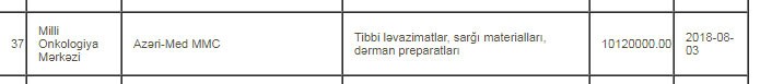Milli Onkologiya Mərkəzi (MOM) avqustun 3-də "Azeri Med" MMC ilə tibbi ləvazimatlar, sarğı materialları, dərman preparatlarının alınmasına dair 10 milyon 120 min manatlıq müqavilə imzalayıb.