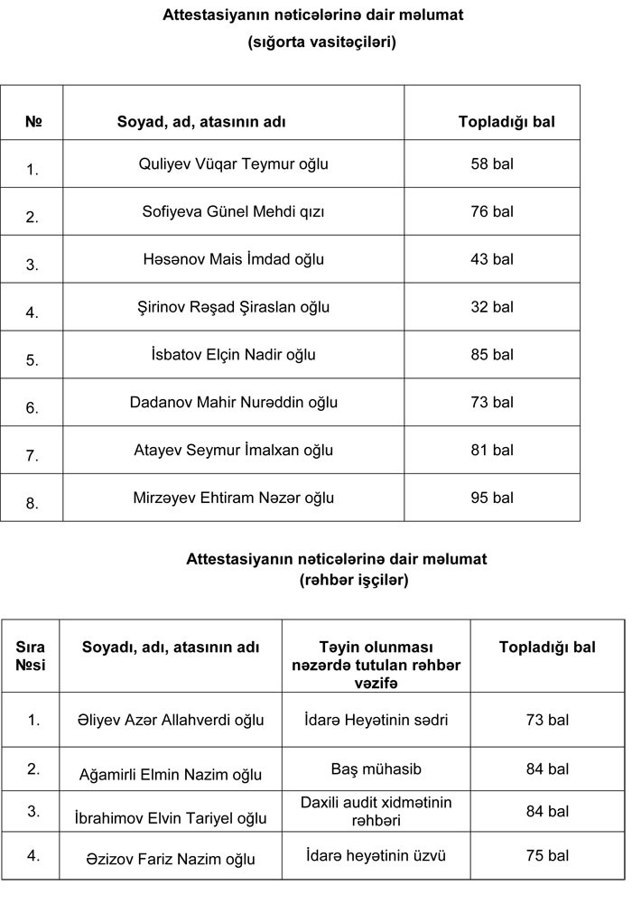 Qeyd edək ki, “Sığortaçıların rəhbər işçisi vəzifələrinə namizədlər müvafiq sığorta vasitəçiliyi üzrə fəaliyyətə lisenziya, həmçinin aktuari fəaliyyətinə aktuari şəhadətnaməsi almaq istəyən fiziki şəxslər üçün attestasiyanın təşkili və keçirilməsi” Qaydalarının 5.6-cı bəndinə əsasən attestasiyada iştirak edən şəxs 70 test tapşırığına düzgün cavab verdikdə attestasiyadan keçmiş hesab olunur.