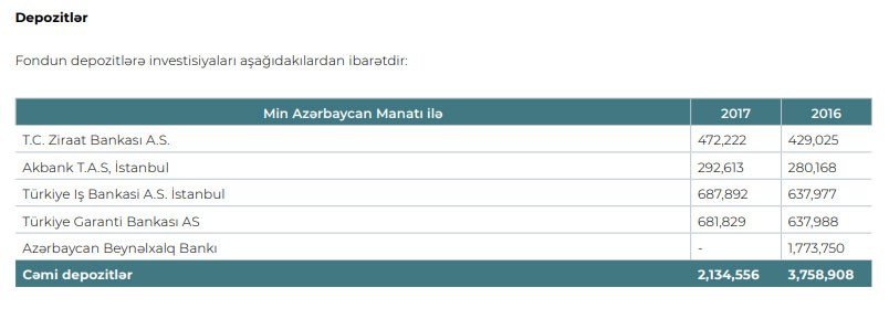 Qeyd edək ki, hesabatda 2017-ci ilin sonunda Neft Fondunun Beynəlxalq Bankdan depoziti olmadığı görünsə də, əslində Fond vəsaitini ABB-nin qiymətli kağızlarına (istiqrazlarına) dəyişdirmişdir.