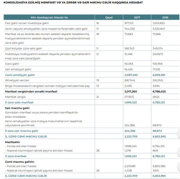 Azərbaycan Respublikası Dövlət Neft Fondu (ARDNF) 2017-ci ili 1 milyard 999 milyon 323 min manat xalis mənfəətlə başa vurub. Bu, 2016-cı illə müqayisədə 3,4 dəfə azdır. Fond 2016-cı ildə 6 milyard 785 milyon 123 min manat xalis mənfəət əldə etmişdi.