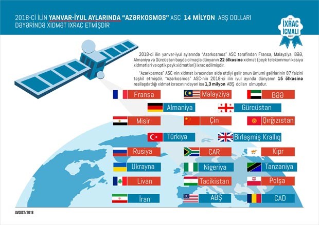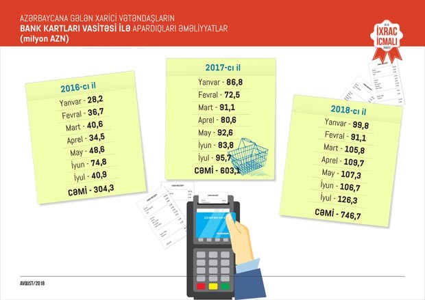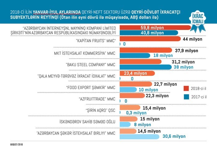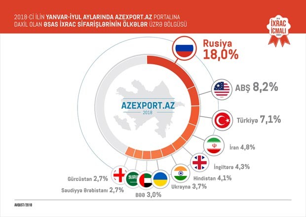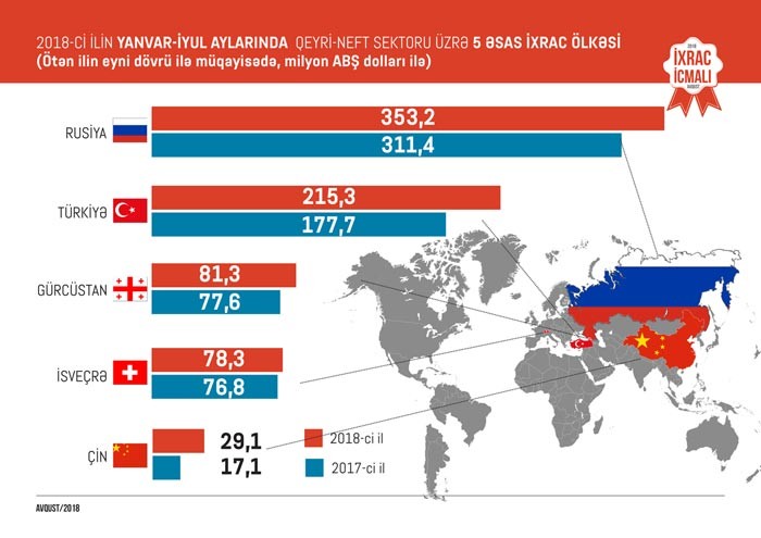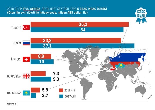 Dövlət Statistika Komitəsinin məlumatına əsasən cari ilin iyul ayında isə qeyri-neft sektoru üzrə ixrac 122 milyon ABŞ dolları təşkil edib. 2018-ci ilin iyul ayında qeyri-neft sektoruna aid ən çox mal ixrac edilən ölkələrin siyahısına Türkiyə (35 milyon ABŞ dolları) liderlik edib. Daha sonra bu siyahıda Rusiya (33 milyon ABŞ dolları), İsveçrə (9 milyon ABŞ dolları), Gürcüstan (7 milyon ABŞ dolları), Qazaxıstan (5,8 milyon ABŞ dolları) və digər ölkələrin adı var.