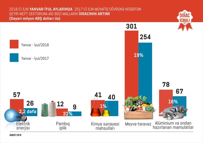 2017-ci ilin müvafiq dövrü ilə müqayisədə 2018-ci ilin ilk 7 ayında elektrik enerjisinin ixracı 2,2 dəfə, pambıq ipliyinin ixracı 32 faiz, alüminium və ondan hazırlanan məmulatların ixracı 16 faiz, meyvə-tərəvəzin ixracı 19 faiz, plastmassa və onlardan hazırlanan məmulatların ixracı 14 faiz, kimya sənayesi məhsullarının ixracı 1 faiz artıb.