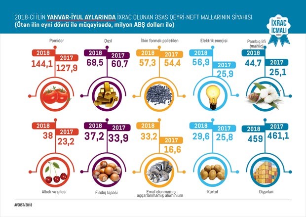 2018-ci yanvar-iyul aylarında ixrac edilən qeyri-neft sektoruna aid malların siyahısında pomidor (144 milyon ABŞ dolları) birinci, qızıl (sikkə kəsilməsində istifadə olunmayan, digər emal olunmamış formalarda – 68 milyon ABŞ dolları) ikinci və xüsusi kütləsi 0,94-dən az olan ilkin formalı polietilen (57 milyon ABŞ dolları) üçüncü olub.
