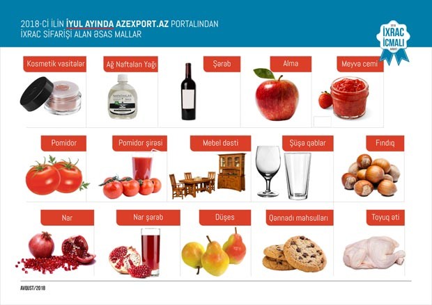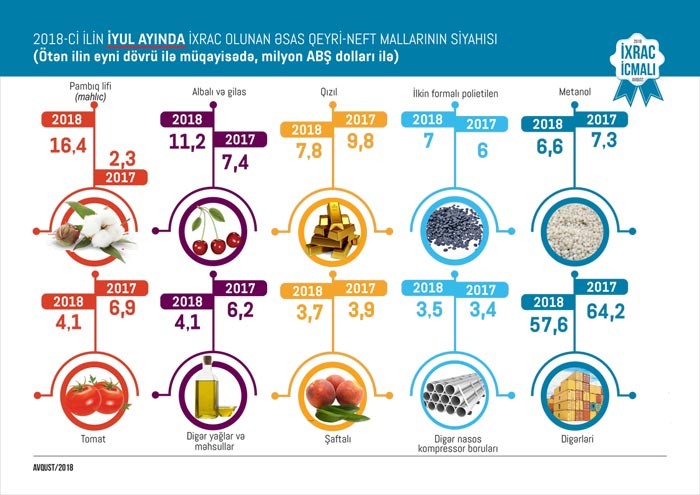 2018-ci ilin iyul ayında da qeyri-neft sektoru üzrə ixracda pambıq lifi (mahlıc) birinci (16 milyon ABŞ dolları), albalı və gilas (11milyon ABŞ dolları) ikinci, qızıl (sikkə kəsilməsində istifadə olunmayan, digər emal olunmamış formalarda - 7,8 milyon ABŞ dolları) isə üçüncü olub.