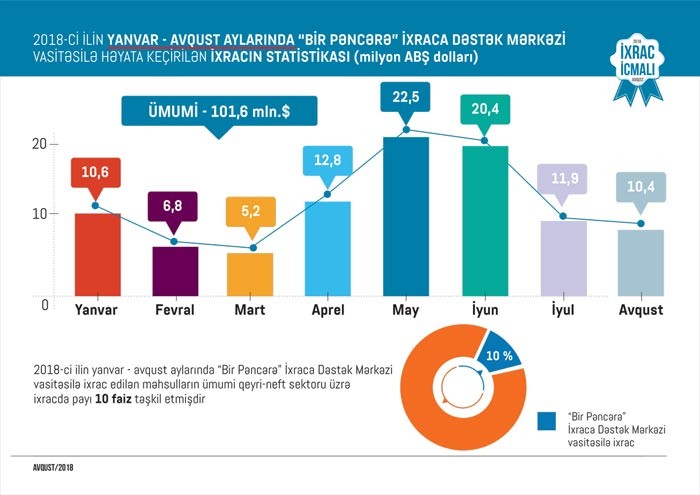 2017-cı ilin müvafiq dövrü ilə müqayisədə cari ilin yanvar-iyul aylarında qeyri-neft sektoru üzrə ixrac 114 milyon ABŞ dolları və ya 13 faiz artıb.