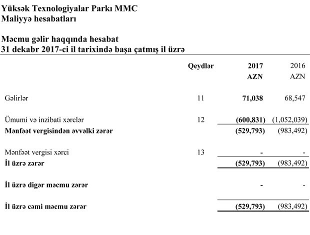"Yüksək Texnologiyalar Parkı" MMC 2017-ci ili 529 min 793 manat zərər ilə başa vurub. Müqayisə üçün qeyd edək ki, 2016-cı ildə MMC-nin zərəri 983 min 492 manat təşkil etmişdi.