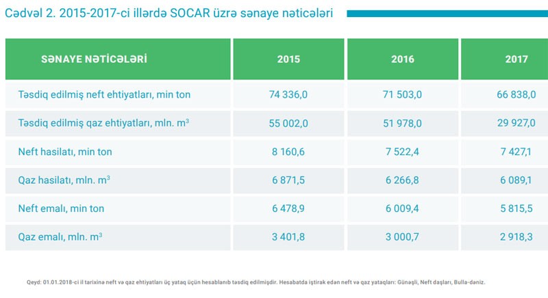 "Marja", SOCAR-ın 2017-ci il üzrə “Davamlı inkişaf haqqında hesabat”ına istinadən xəbər verir ki, 2016-cı illə müqayisədə 2017-ci ildə SOCAR-ın təsdiq edilmiş neft və qaz ehtiyatları azalıb.