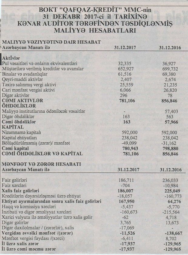 Bank Olmayan Kredit Təşkilatı “Qafqaz Kredit” MMC 2017-ci ili 17 min 937 manat zərər ilə başa vurub. Bu, 2016-cı illə müqayisədə 7,2 dəfə azdır.