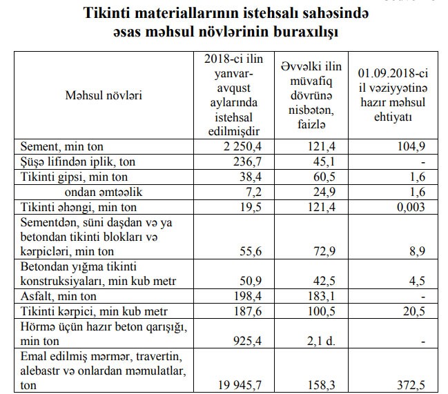 “Marja” Dövlət Statistika Komitəsinin aylıq hesabatına istinadən xəbər verir ki, hörmə üçün hazır beton qarışığının istehsalı 2,1 dəfə, tikinti əhənginin və sement istehsalının hər biri 21,4 faiz, tikinti kərpicinin istehsalı 0,5 faiz artmış, tikinti gipsinin istehsalı 39,5 faiz, betondan yığma tikinti konstruksiyalarının istehsalı 57,5 faiz azalmışdır