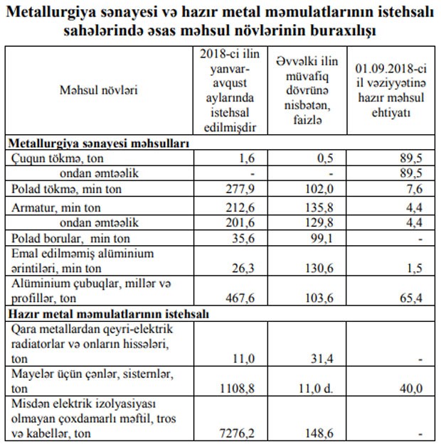 Metallurgiya sənayesi və hazır metal məmulatlarının istehsalı sahələrində yanvar-avqust aylarında 525,3 milyon manatlıq məhsul istehsal olunmuş, hazır metal məmulatlarının istehsalı sahəsində 18,2 faiz, metallurgiya sənayesində isə 13,4 faiz artım müşahidə olunmuşdur. Yanvar-avqust ayları ərzində sahə üzrə 212,6 min ton (35,8 faiz çox) armatur, 7 276,2 ton (48,6 faiz çox) misdən elektrik izolyasiyası olmayan çoxdamarlı məftil, tros və kabellər, 467,6 ton (3,6 faiz çox) alüminium çubuqlar, millər və profillər, 1 108,7 ton (11,0 dəfə çox) mayelər üçün çənlər, sisternlər istehsal edilmişdir.