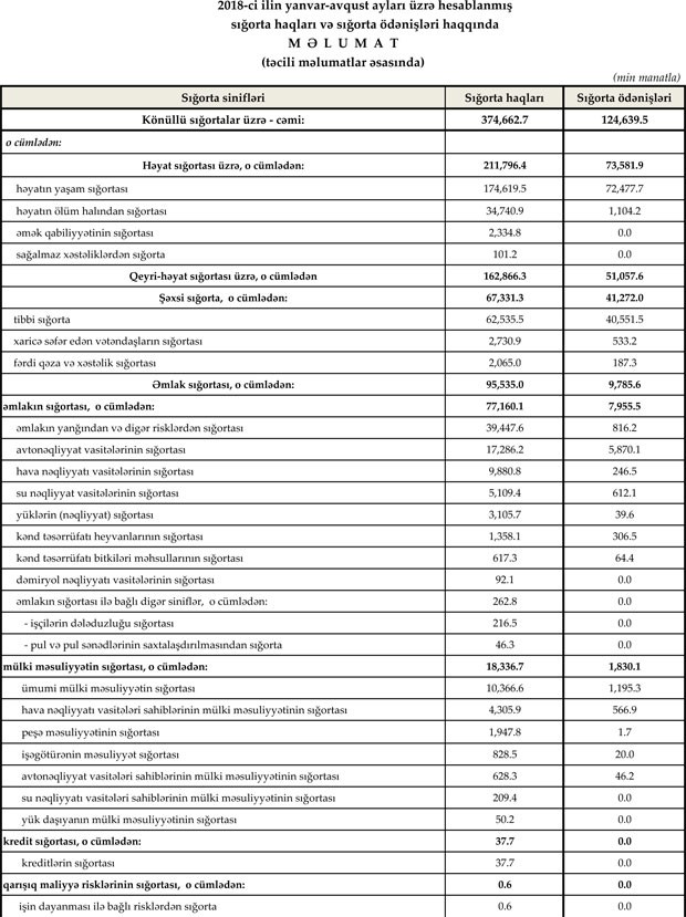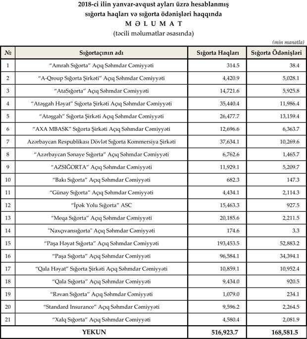 2018-ci ilin yanvar-avqust ayları ərzində ölkədə fəaliyyət göstərən 21 sığorta şirkəti tərəfindən 516 milyon 923 min manat məbləğində sığorta haqları toplanıb, 168 milyon 581 min manat məbləğində sığorta ödənişi həyata keçirilib.
