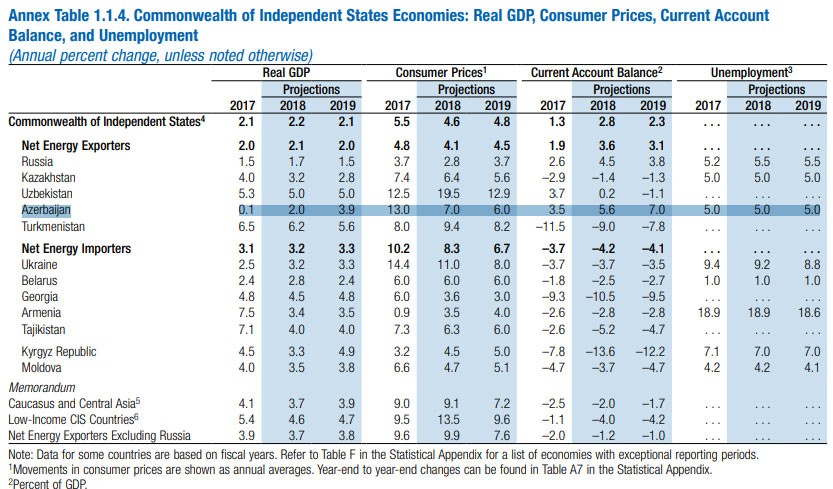 Müqayisə üçün qeyd edək ki, BVF, "Aprel 2018" hesabatında Azərbaycan iqtisadiyyatiyatının 2018-də 2%, 2019-cu ildə isə 3,9% artacağını proqnozlaşdırmışdı. Beləliklə, Azərbaycan iqtisadiyyatına dair iqtisadi artım proqnozları aşağı salınıb.