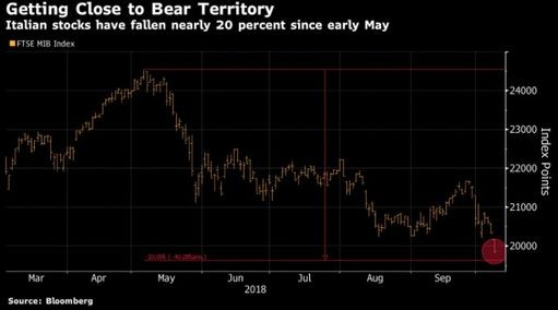 İtaliyada "FTSE MIB" İndeksi 7 Mayda gördüyü ən yüksək səviyyəsi ilə müqyisədə 19 faiz minusdadır. Vəziyyətin "ayı bazarı" sayılması üçün lazım olan geriləmə 20%-dir.