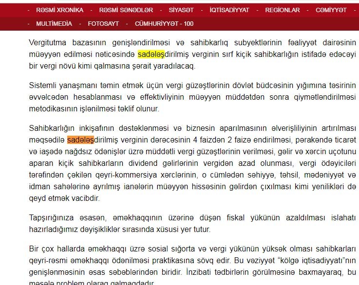 Qeyd edək "Azərtac" İnformasiya Agentliyi sonradan nazirin çıxışının mətnində dəyişiklik edib. İlk yayımlanmış mətndə "sadələşdirilmiş verginin dərəcəsinin 4 faizdən 2 faizə endirilməsi" ifadəsinə yer verilmişdi. Dəyişikliyə görə, "sadələşdirilmiş verginin dərəcəsinin 4 faizdən 2 faizə endirilməsi" ifadəsi "sadələşdirilmiş verginin dərəcəsinin endirilməsi" ifadəsi ilə əvəz edilib.