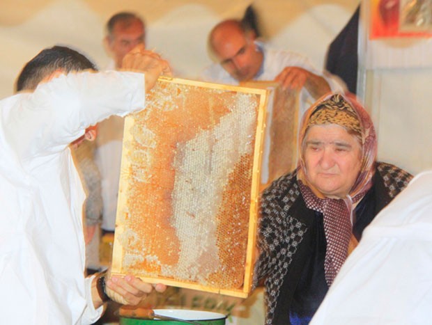 Satıcılar əllərindəki qaşıqla kəhrəba rəngli balı həvəslə yuxarı qaldıraraq süzür, müştəriləri məhz onun satdığı balın daha yaxşı olmasına inandırmağa çalışırlar.