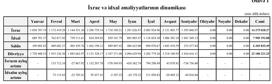 Sentyabrda ixrac1 milyard 395 milyon 47 dollar, idxal isə 1 milyard 41 milyon 569 min dollar təşkil edib. Avqustda ixrac 2 milyard 131 milyon 803 min dollar, idxal isə 1 milyard 86 milyon 385 min dollar təşkil etmişdi. Avqust ayı ilə müqayisədə Sentyabrda ixrac 1,5 dəfə azalıb.