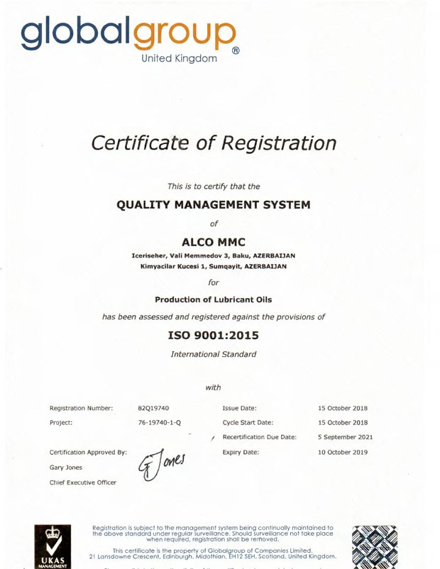 "Aminol" sürtgü yağlarının istehsalçısı "Alco" MMM, 24.09.2018 tarixində İSO 9001-2008 formasından İSO 9001-2015 formasına keçid edən İSO keyfiyyət standartının yeni versiyasını alan ilk Azərbaycan şirkətidir.