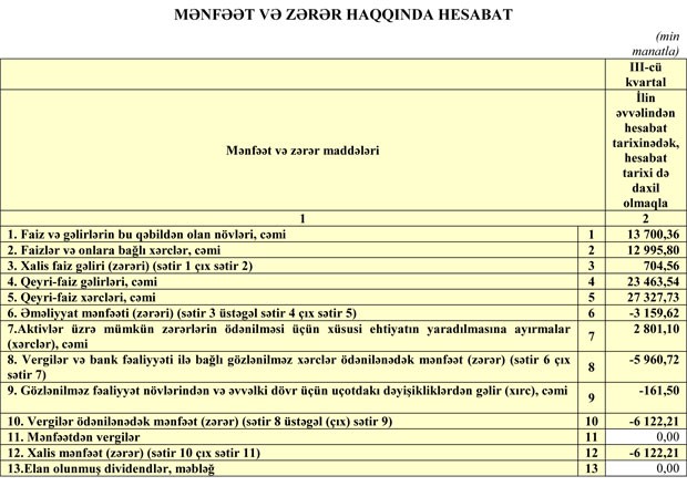 “AG Bank” ASC 2018-ci ilin 9 ayını 6 milyon 122 min manat xalis zərər ilə başa vurub. Müqayisə üçün qeyd edək ki, Bank, ötən ilin eyni dövrünü 1 milyon 699 min manat xalis zərər ilə bağlamışdı. Beləliklə, Bankın zərəri 3,6 dəfə artıb.