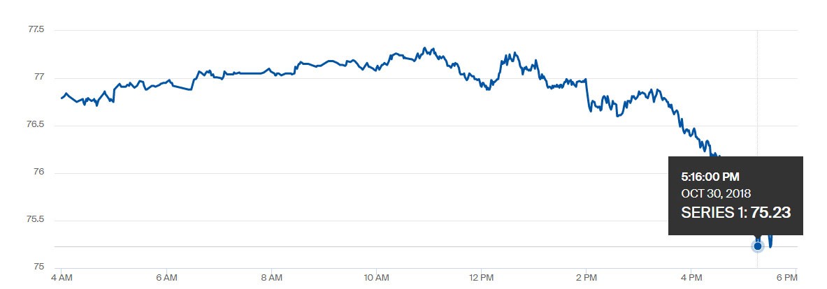 "Marja" xəbər verir ki, Bakı vaxtı ilə saat 17:54-də Brent nefti 2.4% ucuzlaşma ilə 75,23 dollara düşüb.