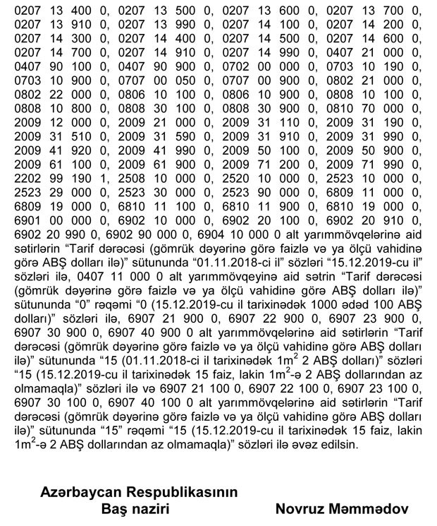 Qeyd edək ki, Qərara əsasən, bir sıra idxal kənd təsərrüfatı, ərzaq və tikinti sənayesi məhsullarının xüsusi gömrük rüsumlarının müddəti noyabrın 1-dən 2019-cu il dekabrın 15-dək uzadılır.