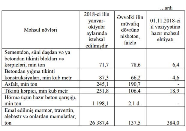 “Marja” Dövlət Statistika Komitəsinin aylıq hesabatına istinadən xəbər verir ki, hörmə üçün hazır beton qarışığının istehsalı 2,1 dəfə, sementin istehsalı 22,1 faiz, tikinti kərpicinin istehsalı 6,4 faiz artmış, tikinti əhənginin istehsalı 10,9 faiz, betondan yığma tikinti konstruksiyalarının istehsalı 33,8 faiz, tikinti gipsinin istehsalı 51,5 faiz azalmışdır.