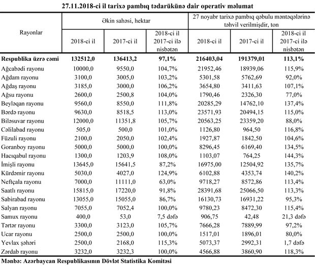 Marja respublikada pambıq tədarükünə dair noyabrın 27-nə olan operativ məlumatı təqdim edir.