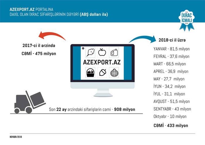 “İxrac İcmalı”nda 2018-ci ilin yanvar-oktyabr ayları ərzində Azexport.az portalına daxil olan ixrac sifarişləri barədə də məlumat verilib. Göstərilib ki, 2018-ci ilin oktyabr ayı ərzində Azexport.az portalına 23 milyon ABŞ dolları məbləğində ixrac sifarişləri daxil olub. Ümumilikdə isə 2018-ci ilin 10 ayında Azexport.az portalına daxil olan ixrac sifarişlərinin dəyəri 433 milyon ABŞ dolları təşkil edib. 2017-ci ilin müvafiq dövrü ilə müqayisədə 2018-ci ilin yanvar-oktyabr aylarında Azexport.az portalına daxil olan ixrac sifarişləri dəyər baxımından 10 faiz artıb. Məlumat üçün qeyd edək ki, 2017-ci ilin yanvar ayından 2018-ci ilin 31 oktyabr tarixinə kimi (22 ay ərzində) Azexport.az portalına dünyanın 108 ölkəsindən daxil olan ixrac sifarişlərinin dəyəri 908 milyon ABŞ dolları təşkil edib.