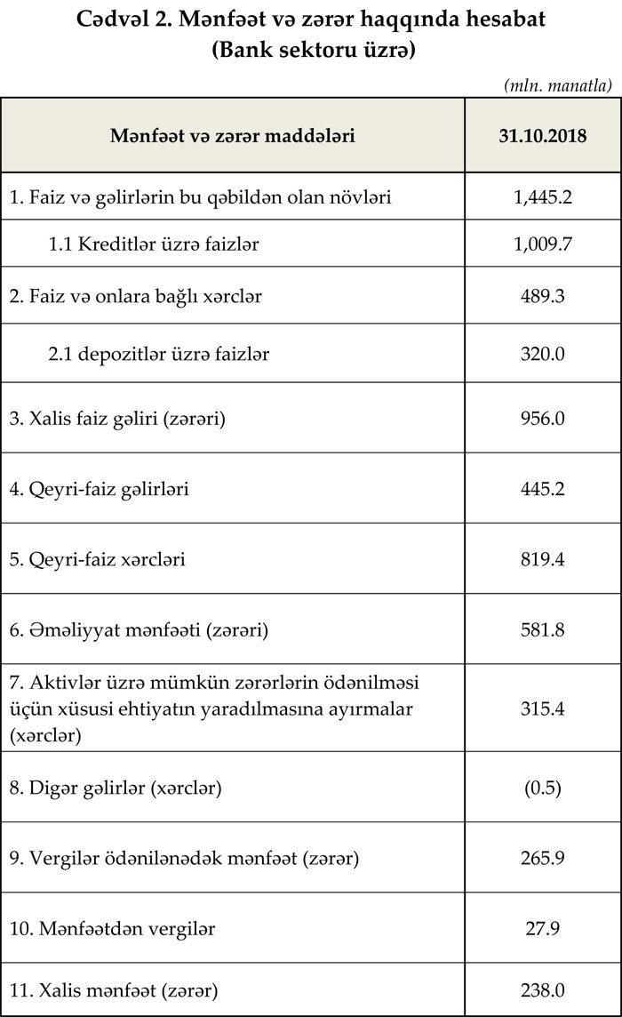 2018-ci ilin oktyabr ayı ərzində bank sektorunun aktivləri 1.7% (488.4 milyon manat), öhdəlikləri 1.7% (429.2 milyon manat), balans kapitalı isə 1.4% (59.2 milyon manat) artıb.