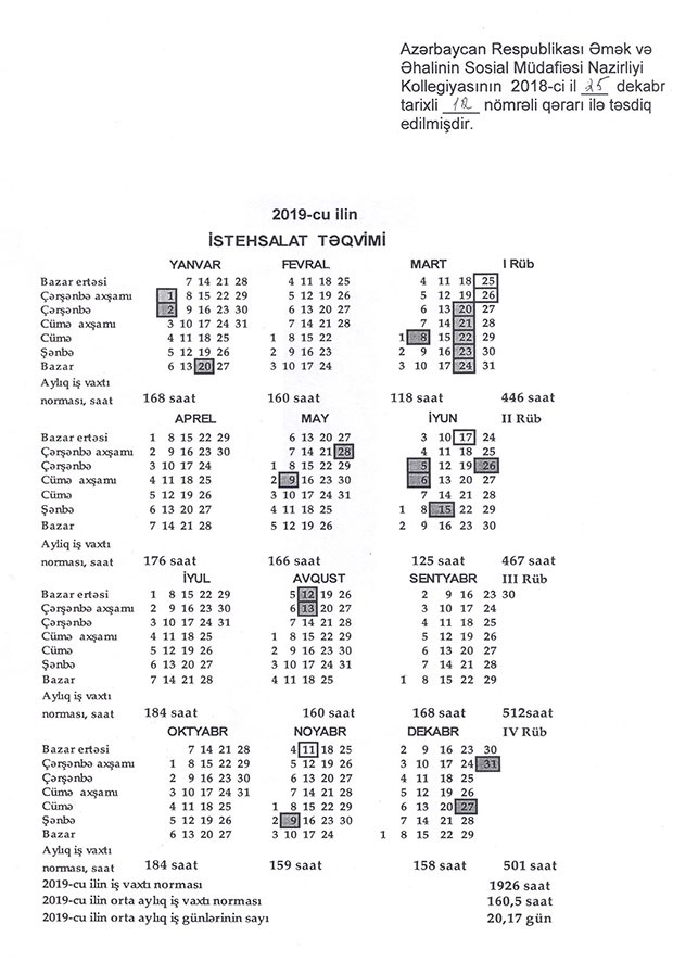 Əmək və Əhalinin Sosial Müdafiəsi Nazirliyinin Kollegiyasının 25 dekabr 2018-ci il tarixli 12 nömrəli qərarı ilə 2019-cu ilin iş vaxtı norması və istehsalat təqvimi təsdiq edilib.