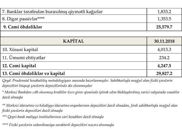 30 noyabr 2018-ci il tarixinə Azərbaycanda fəaliyyət göstərən bankların cəmi aktivləri 29 milyard 827.2 milyon manat, cəmi öhdəlikləri isə 25 milyard 579.7 milyon manat təşkil edib.Sektorun balans kapitalı isə 4 milyard 247.5 milyon manat olub.