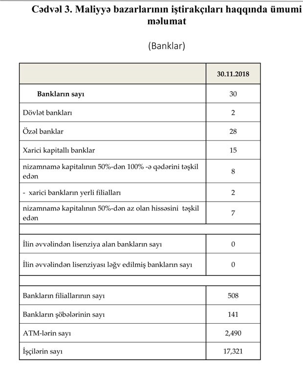 Fəaliyyət göstərən 30 bankın filiallarının sayı 508, şöbələrinin sayı 141, ATM-lərin sayı 2 490 olub.