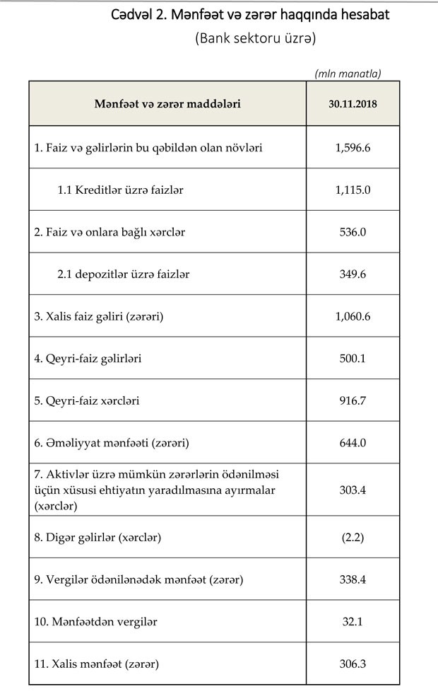 2018-ci ilin 11 ayı üzrə bank sektorunun xalis mənfəəti 306.3 milyon manat təşkil edib. Müqayisə üçün qeyd edək ki, bank sektoru 2017-ci ilin 11 ayını 592.7 milyon manat xalis mənfəətlə bağlamışdı. Beləliklə, sektorun xalis mənfəəti 48,3% azalıb.