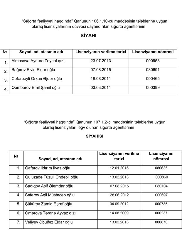 Maliyyə Bazarlarına Nəzarət Palatasının (Palata) İdarə Heyətinin qərarı ilə Ağalarov Mircamal Hüseyn oğluna sığorta agenti fəaliyyətinə lisenziya verilib, 4 fiziki şəxsin sığorta agenti fəaliyyətinə verilmiş lisenziyasının qüvvəsi 3 ay müddətinə dayandırılıb və 8 fiziki şəxsin sığorta agenti fəaliyyətinə verilmiş lisenziyası məcburi qaydada ləğv edilib.