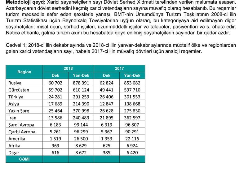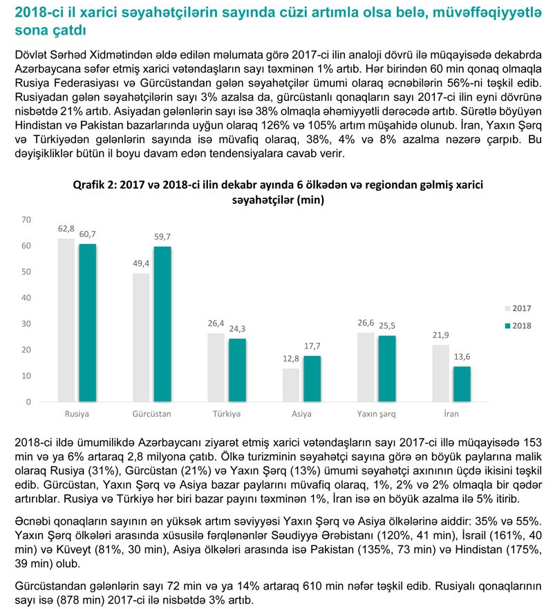 2018-ci ilin dekabrında 2017-ci ilin analoji dövrü ilə müqayisədə Azərbaycana səfər etmiş xarici vətəndaşların sayı təxminən 1% artıb.
