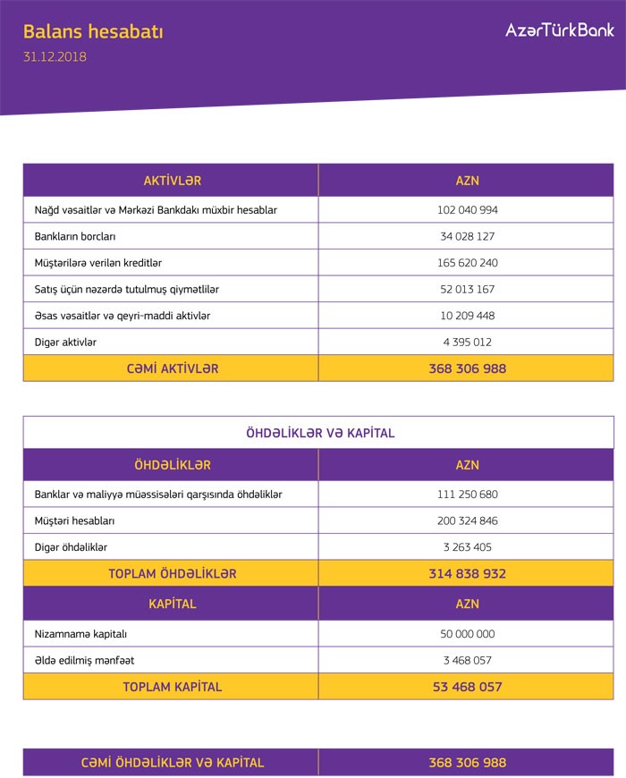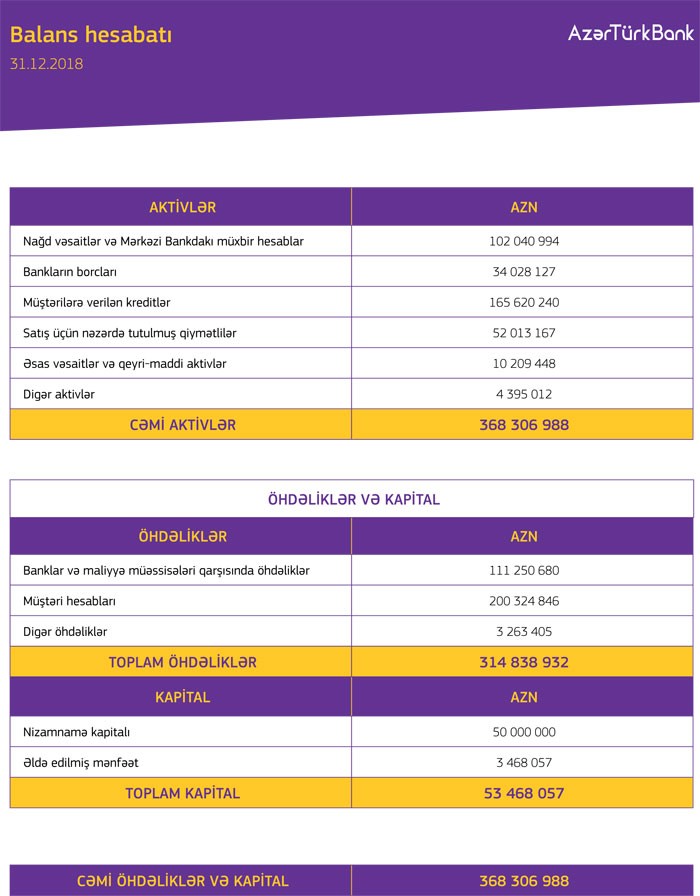 2017-ci illə müqayisədə 2018-ci ildə “Azər-Türk Bank” ASC-nin cəmi aktivləri 10% artaraq 368 milyon 307 min manata çatıb.