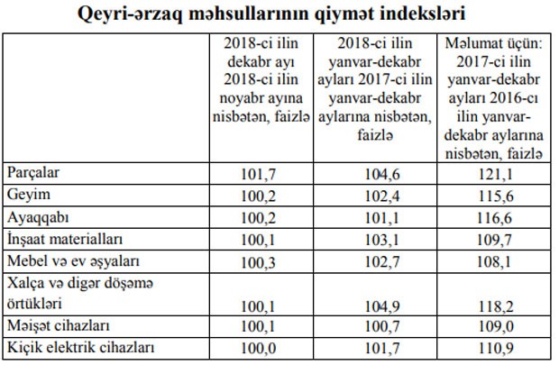 2018-ci ilin dekabr ayında qeyri-ərzaq məhsullarının qiymətləri noyabr ayına nisbətən 0,2 faiz, 2018-ci ilin yanvar-dekabr aylarında əvvəlki ilin müvafiq dövrünə nisbətən isə 2,6 faiz artıb.