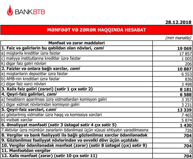 “Bank BTB” ASC 2018-ci ili 704 min manat xalis mənfəət ilə başa vurub. Müqayisə üçün qeyd edək ki, Bank 2017-ci ili 687 min manat xalis mənfəət ilə bağlamışdı. Beləliklə, illik müqayisədə “Bank BTB”nin xalis mənfəəti 2,5% artıb.